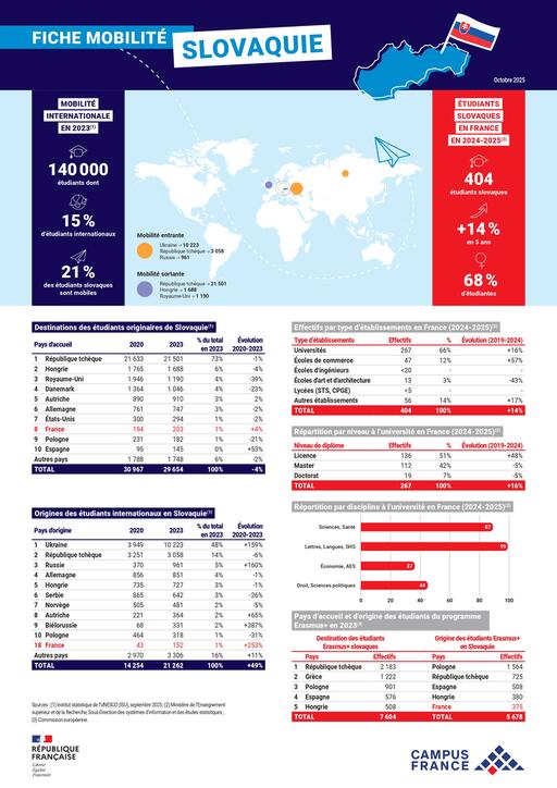 Huitième destination des étudiants originaires de Slovaquie, la France a accueilli plus de 400 étudiants slovaques en 2024-2025 et constate une hausse de ces effectifs de 14% en cinq ans.